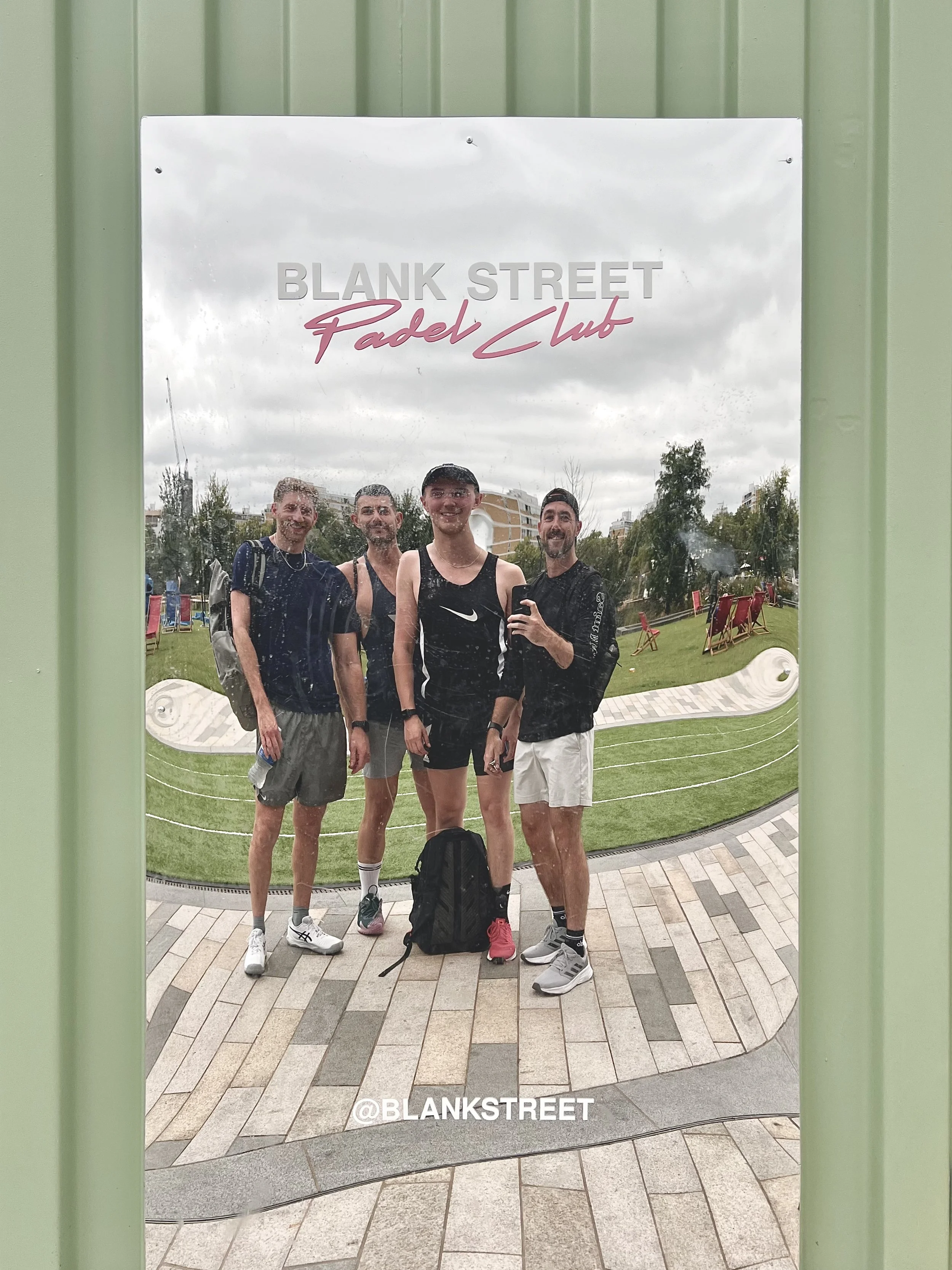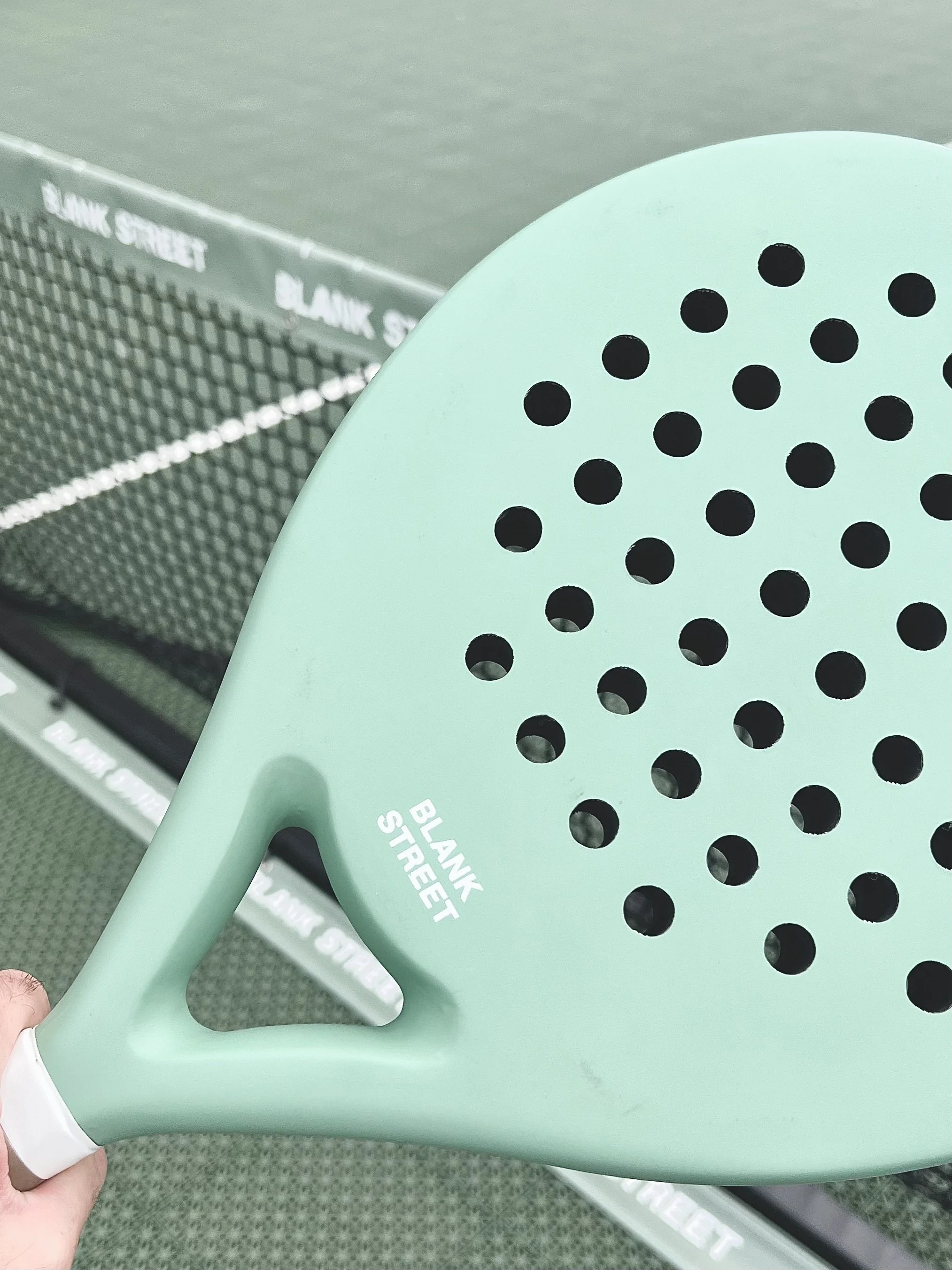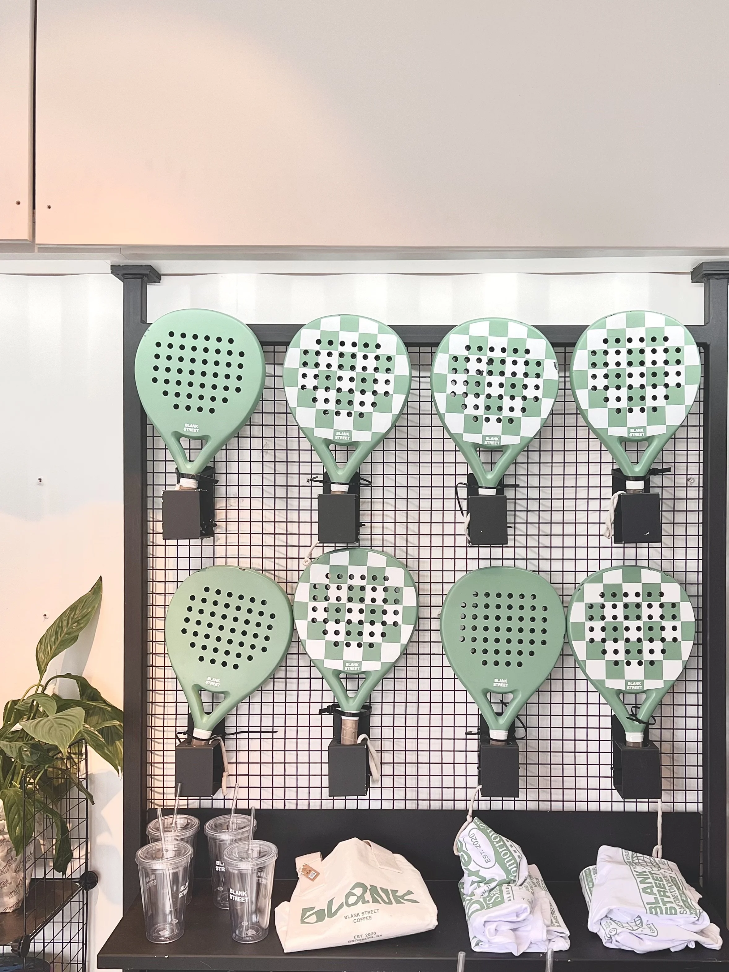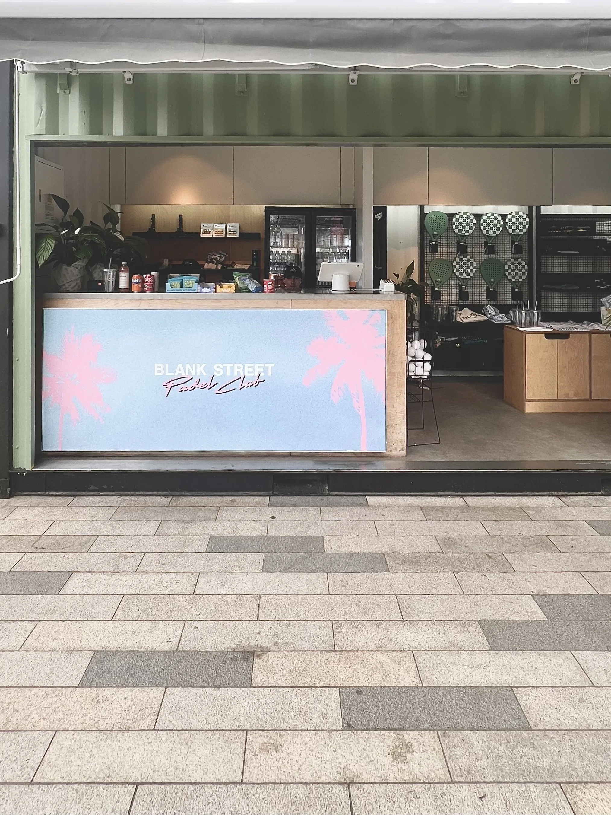 as a recent fan of padel, I couldn’t resist going to play at the popup court that coffee chain blank space have installed. serving Palm Springs, Miami neon, 90s sports club vibes in their signature green, contrasted by pink palm tree graphics and branded merch to compliment.